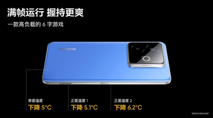 在全新固态制冷方式下,手机内侧直接制冷。开启TEC制冷后,一键降低至高6℃,保证高负载游戏满帧运行的同时,握持体验更爽。另外,据官方称,为了更直观体现手机降温的过程,真我还添加冰感变色工艺,机身颜色随手机温度变化。