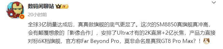 数码博主“数码闲聊站”也再次爆料了这款新机的部分配置信息,据其称,“全球3亿销量达成后,真真做旗舰的底气更足了。这次的SM8850真旗舰真冲高,会有颠覆想象的「影像合作」,安排了Ultra才有的2K直屏+2亿长焦,产品力直接对标6K档旗舰,官方称Far Beyond Pro,莫非命名是真我GT8 Pro Max?!”此前,该博主还曾爆料该机将会配备2K直屏、2亿大底潜望长焦和3D超声波指纹等配置。